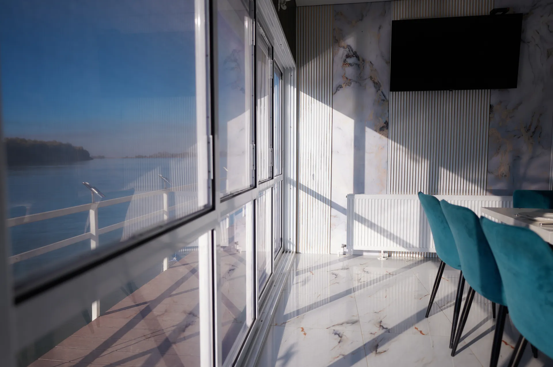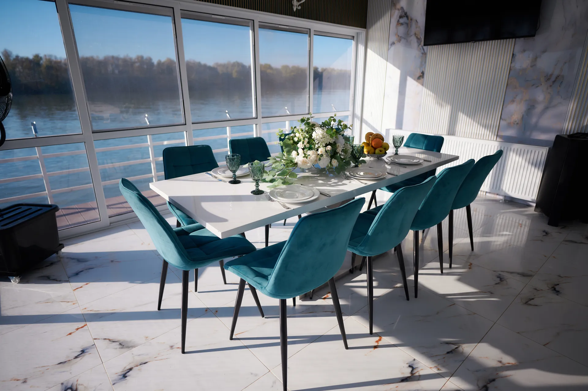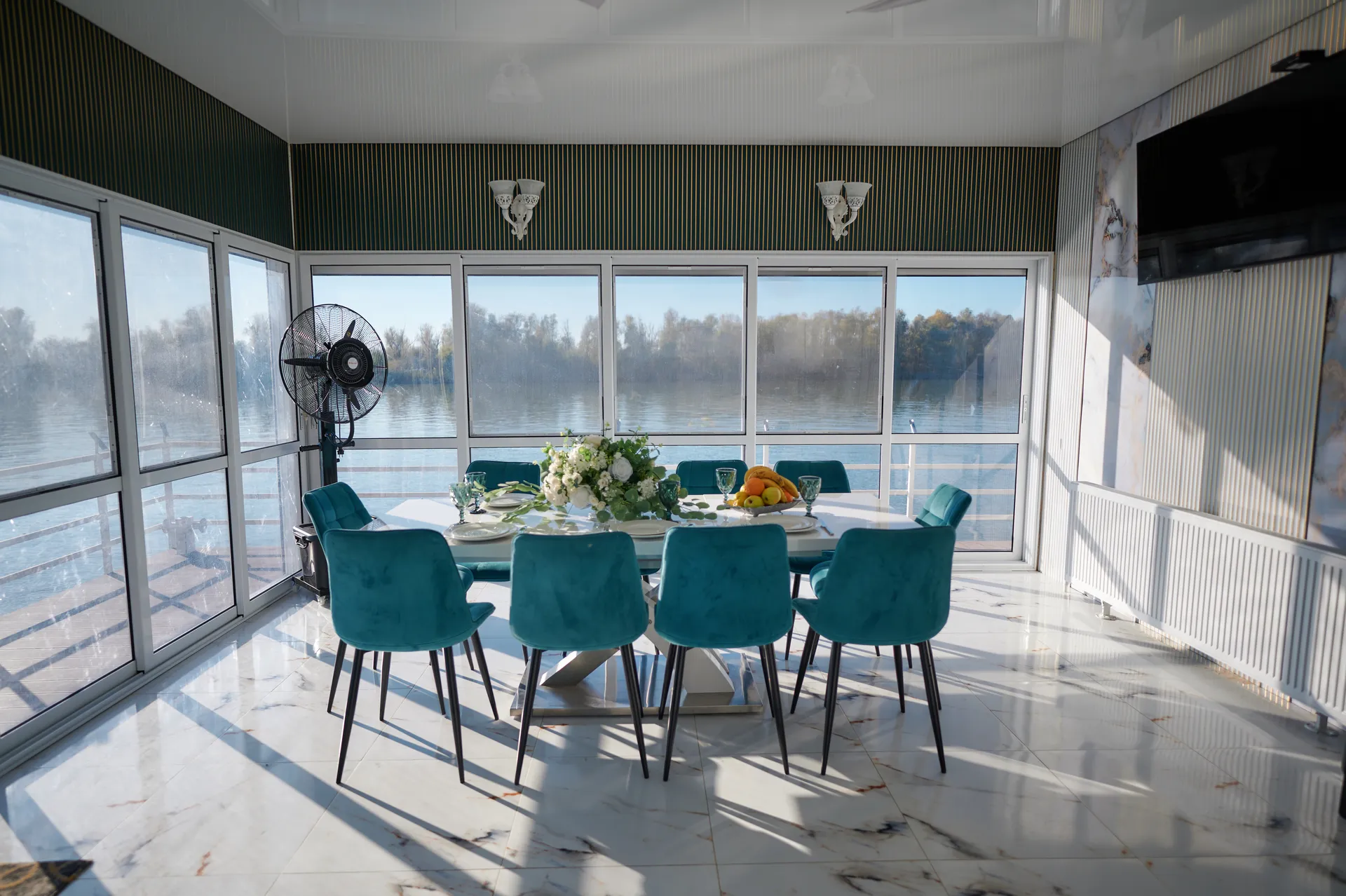 Un spațiu deschis, unde nu pierzi contactul cu apa nici când ești în interior. Datorită pereților vitrați, vezi activitatea de pe canal și vremea direct de la masă. Ești la un pas de terasă: dacă sare știuca, ai ieșit imediat.